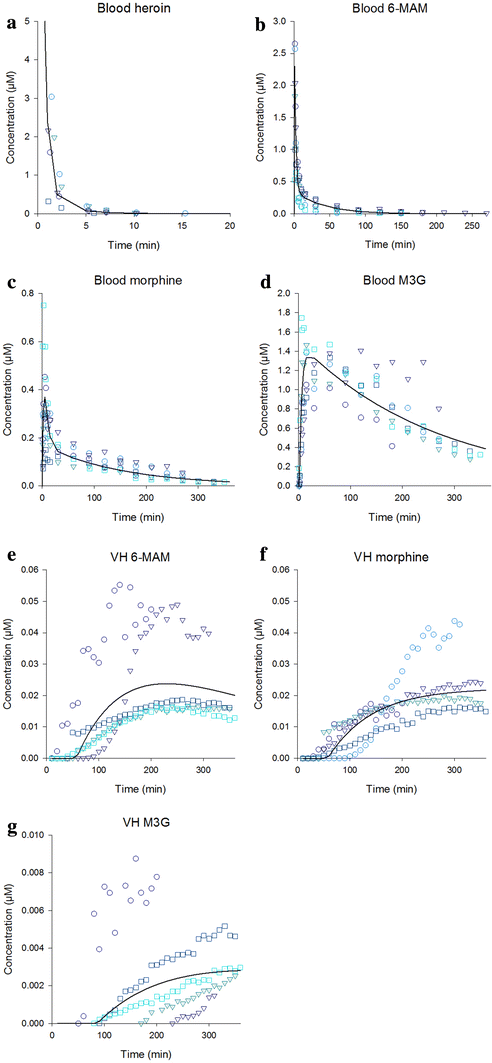 Blood and vitreous humor (VH) concentrations of heroin, 6-monoacetylmorphine (6-MAM), morphine, and morphine-3-glucuronide (M3G) after intravenous administration of 20 mg heroin. Points represent the observed concentrations (the different symbols representing the different animals), lines show the fitted values calculated in the Kinetica software. a–d Observed and fitted values for each separate compound in blood (n = 6) (for heroin, n = 5). e–g Observed and fitted values for each separate compound in VH (n = 5)