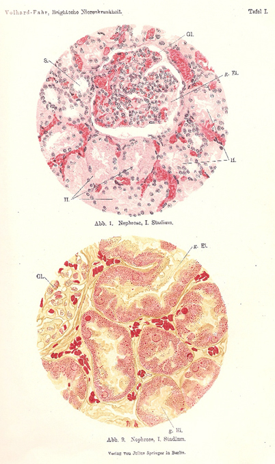 Die standardisierte und wissenschaftlich begründete Einteilung von unterschiedlichen Nierenerkrankungen aufgrund von morphologischen Untersuchungen und die Korrelation mit klinischen Befunden wurde bahnbrechend beeinflusst von dem berühmten Buch des Klinikers Franz Volhard zusammen mit dem Pathologen Theodor Fahr von 1914 mit dem Titel „Die Bright’sche Nierenkrankheit, Klinik, Pathologie und Atlas“(Abb. 1). Fahr und Volhard schrieben damals in ihrem Vorwort „Wir wären glücklich, wenn manches von dem, was wir mitzuteilen haben, sich als brauchbarer Baustein zu dem seit Jahren von neuem Stolz aufstrebendem Gebäude der Nierenpathologie erweisen sollte“.