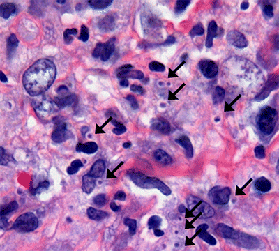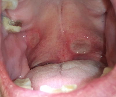 A 66-year-old male presented with oral pain during eating and a 30 lb weight loss over 2 months. He resided in California but grew up near New Orleans and the Mississippi River. He last visited New Orleans 9 months before the onset of symptoms. A workup and history were negative for immunodeficiency. Exam revealed tenderness over the gingiva, base of the tongue and ulcers on the soft palate (Fig. 1). Chest x-ray was unremarkable. Biopsy of the tongue base demonstrated non-caseating granulomas. Stainings of the tissue showed encapsulated intracellular organisms, including budding yeast forms, within histiocytes (Fig. 2) consistent with histoplasmosis. Based on the time course of his weight loss and fatigue, the patient was presumptively diagnosed with chronic disseminated histoplasmosis. He was successfully treated with liposomal amphotericin B, followed by itraconazole.