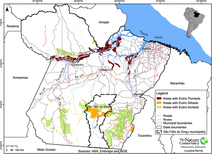To illustrate deforestation and land use dynamics that have characterized the forest frontier of Pará and other parts of the Brazilian Amazon, we look in more detail at the example of the municipality of São Félix do Xingu, located within the arc of deforestation in the southeastern part of the state (Fig. 1). With 8,432,811 ha, almost the size of Portugal, it is among the largest municipalities in Brazil. As in other parts of the Amazon, land ownership is highly unequal, with 52 % of the properties having 100 ha or less and covering 6 % of the total area, 38 % of the properties having between 100 and 1000 ha and covering 28 % of the area, and 10 % of the properties having more than 1000 ha and covering 70 % of the area (The Nature Conservancy, unpublished data). More than half (59 %) of the area of the municipality is located within protected areas and indigenous lands, while the unprotected part has seen rapid deforestation and fragmentation due to the expansion of cattle ranching over the past 20 years. When the Brazilian government carried out the first soil survey of the area in the mid-1970s to assess its agricultural suitability, the region was covered by forest that was only used for extractivism of rubber and Brazil nuts (Bertholletia excelsa), with a few plots planted with annual crops (SONDOTÉCNICA 1976). Timber (especially mahogany, Swietenia macrophylla) extraction from its vast forests followed and cattle ranching soon became the predominant land use on deforested land.