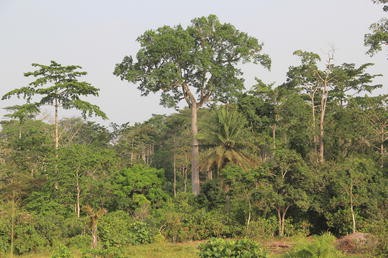 Large trees such as this remnant tree in a cocoa (Theobroma cacao) farm in Côte d’Ivoire store more carbon than small trees while interfering less with the light environment of the cocoa trees (photo: G. Schroth)
