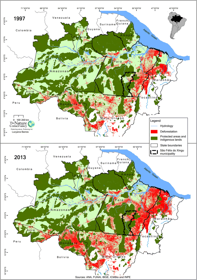 Progressive deforestation in the Amazon biome between 1997 and 2013, including the state of Pará and the municipality of São Félix do Xingu (data downloaded from http://www.obt.inpe.br/prodes/index.php on 24 Jan 2014)