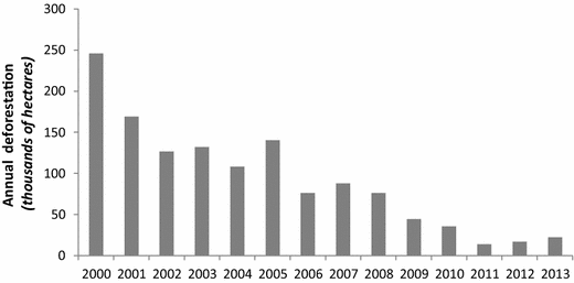 Decrease of the annually deforested area since the year 2000 in the municipality of São Félix do Xingu, southeastern Pará, Brazil, as a combined effect of increased enforcement of environmental legislation and clearing of the most accessible and suitable lands for ranching (data downloaded from http://www.obt.inpe.br/prodes/index.php on 24 Jan 2014)
