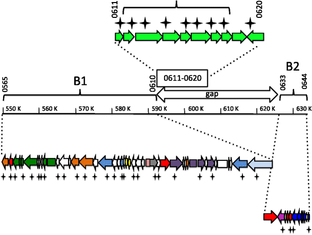 Schematic depiction of proteins in the BwStr WO phage proteome matched to peptides from homologs encoded by the A wMel WO-B prophage. As detailed by Kent et al. (2011), A wMel WO-B occurs as two blocks of phage genes (B1 and B2) separated by ∼35 kb of non-phage DNA. The central schematic represents the complete WO-B phage extending from WD0565 to WD0644. The region labeled “gap” corresponds to 35 kb separating B1 and B2 that contains foreign genes (WD0611 to WD0620) shown at top as light green arrows representing open reading frames. The bracket indicates genes that occur as syntenic arrays of homologs on three rickettsial plasmids. At the bottom, open reading frames of genes in the B1 and B2 blocks are indicated by color-coded arrows oriented in the direction of transcription (phage head, purple; baseplate, dark blue; tail, green; recombinase, pink; replication, light blue; transposase, yellow; virulence factors, orange as depicted in Fig. 1 in Kent et al. 2011). Stars designate proteins matched to B wStr peptides.