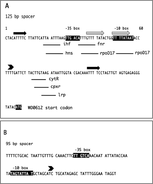 Non-coding sequences in the WD0611–WD0620 syntenic array. Sequences of the non-coding 125-bp region upstream of WD0612 (A) and the 95-bp region downstream of WD0618 (B) were annotated using Softberry BPROM prediction (http://linux1.softberry.com/berry.phtml?topic=bprom&group=programs&subgroup=gfindb; Solovyev and Salamov 2011). In A and B, the –35 and –10 boxes associated with predicted promoters are indicated in white font with black shading, and an arrowhead above the sequence marks the promoter site. (A) black and gray horizontal arrows above the sequence indicate two sets of direct repeats; positions of DNA-binding protein and transcription factor interaction sites described in the “Results” are indicated by bars below the sequence. The ATG start site for WD0612 is indicated in white font with black shading. (B) No predicted transcription factor binding sites occur in the 95-bp sequence.