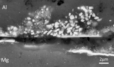 The control of intermetallic formation in Al-Mg bimetallic welding is an important issue that so far has prevented the adoption in service of any safety-critical welded joints between these two materials. In the literature, only a limited number of attempts to control the IMC reaction between aluminum and magnesium in welds have been reported to date, through using interlayers of various materials inserted in the joint interface.[27,28] The objectives of this work were to introduce a material between the weld members which forms less detrimental IMCs or that reduces the rate of reaction, by either creating a barrier to diffusion or through introducing a slower diffusing species. Some success has been noted by the use of a zinc interlayer in diffusion bonding aluminum to magnesium, which was found to produce a slower-growing MgZn2 Laves-type phase at the interface.[27] A cerium foil interlayer has also been used in laser-TIG hybrid welds with a slight increase in weld strength reported.[28]