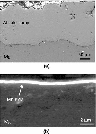 SEM images of cross sections through the coatings investigated: (a) the 100-μm-thick aluminum cold spray coating and (b) the thinner 1-μm-thick manganese PVD barrier coating, both applied to the AZ31 magnesium sheet