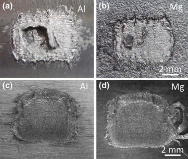 Examples fracture surfaces from the pre-coated Al-Mg welds for: (a) the aluminum surface that was welded to (b) the cold spraycoated magnesium sheet and (c) the aluminum surface that was welded to the (d) Mn-PVD-coated Mg sheet, both for a welding time of 0.8 s