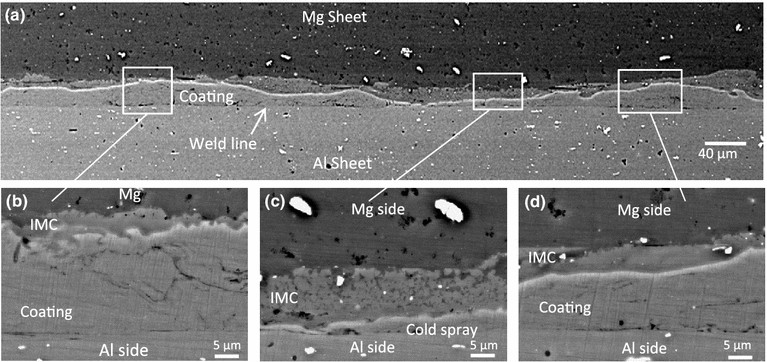 SEM images showing the IMC reaction layer formed at the interface between the Al cold spray coating and Mg substrate after USW with a welding duration of 0.5 s: (a) overview and (b) through (d) selected areas at higher magnification
