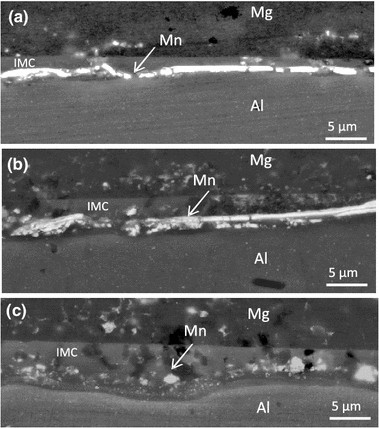 SEM images showing the breakup of the Mn barrier coating and growth of the IMC reaction layer with increasing welding times of (a) 0.3, (b) 0.7, and (c) 1.1 s