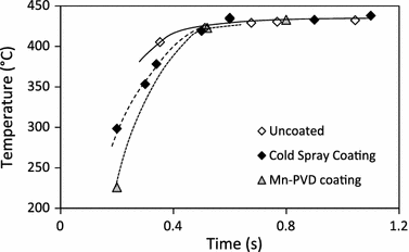 Maximum interface temperatures recorded by thermocouple measurements, as a function of welding time, for Al-Mg welds produced with uncoated and pre-coated Mg sheet