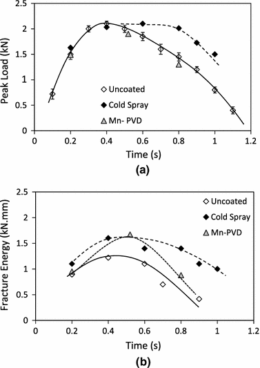 Lap shear test results, as a function of welding time, showing (a) the peak failure load and (b) the fracture energy of welds produced with cold spray and PVD Mn coatings, compared to results from welds without pre-coating the magnesium