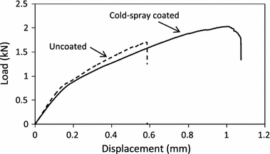 Comparison between the lap shear test load–displacement curves recorded for a cold spray-coated and -uncoated magnesium sheet, joined to aluminum using USW, with a duration of 0.80 s