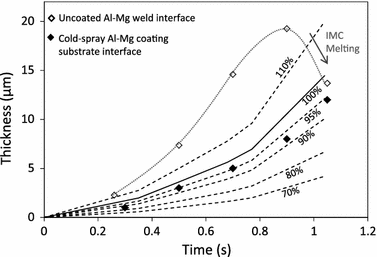 Reaction layer thickness predictions from thermal cycles measured at the Al-Mg joint interfaces in welds with no coating, using static growth rate constants (solid line) and showing (i) the effect of a 10 pct increase, due to a thermocouple under-reading and (ii) a range of possible reductions in peak temperature below the join line at the interface between the Al cold spray coating and Mg substrate (dashed lines). The predictions are compared to the actual IMC layer thicknesses measured for welds produced with uncoated and cold spray-coated Mg sheet (symbols)