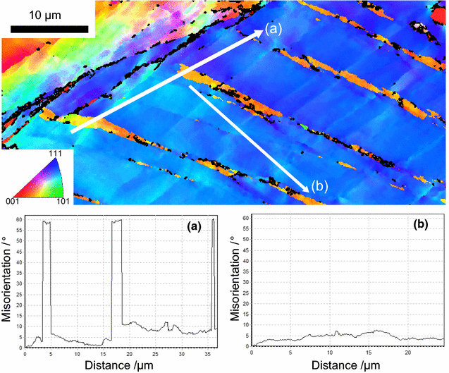 EBSD analysis displaying orientation and misorientation profiles showing twins with angle of 60 deg (a) and low-angle deformation (b) in Sanicro 25 at 923 K (650 \(^{\circ }\)C)