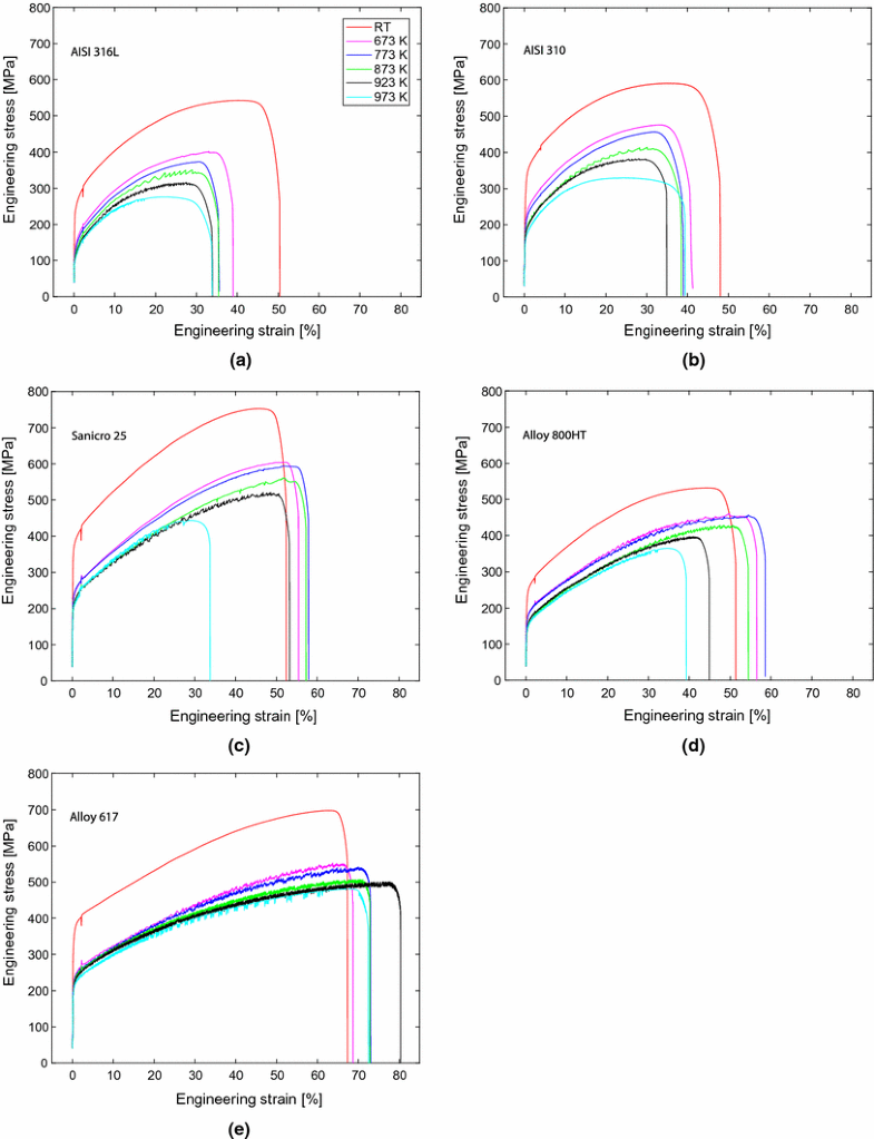 Engineering stress–strain curves for all materials at all tested temperatures of AISI 316L (a), AISI 310 (b), Sanicro 25 (c), Alloy 800HT (d) and Alloy 617 (e). Same legend as in (a) for all curves
