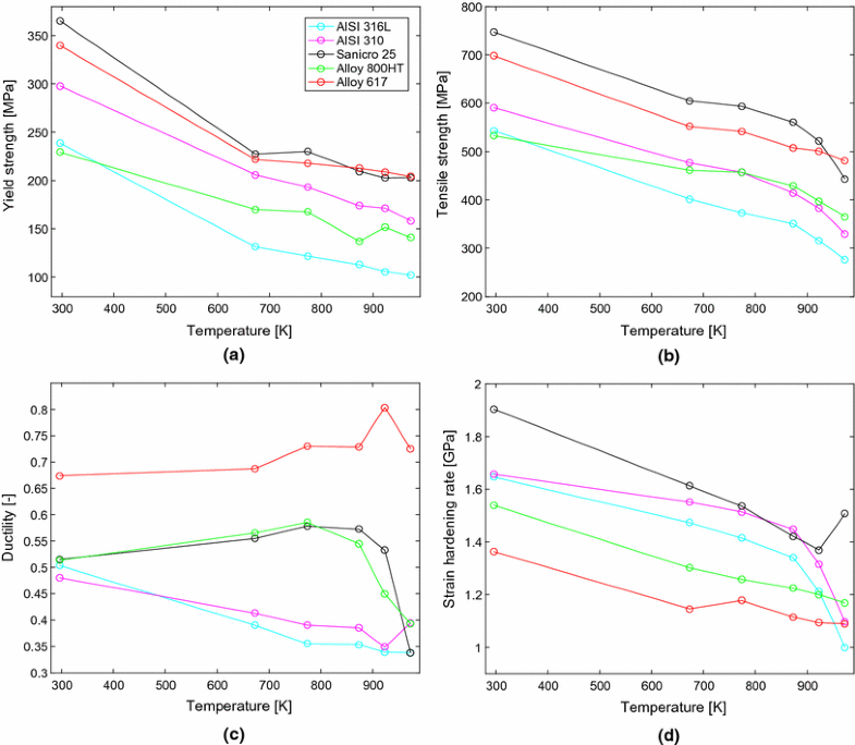 The temperature dependence of ductility (strain to rapture), however, was different for the studied materials. Three different ductility responses could be distinguished, as seen in Figure 3(c). AISI 316L and AISI 310 showed decreasing ductility with increasing temperature compared with RT. Sanicro 25 and Alloy 800HT had ductilities that initially increased until reaching 973 K and 923 K (700 \(^{\circ }\)C and 650 \(^{\circ }\)C), respectively, where they dropped compared to RT. Alloy 617 showed a ductility at elevated temperatures that was higher compared with RT.