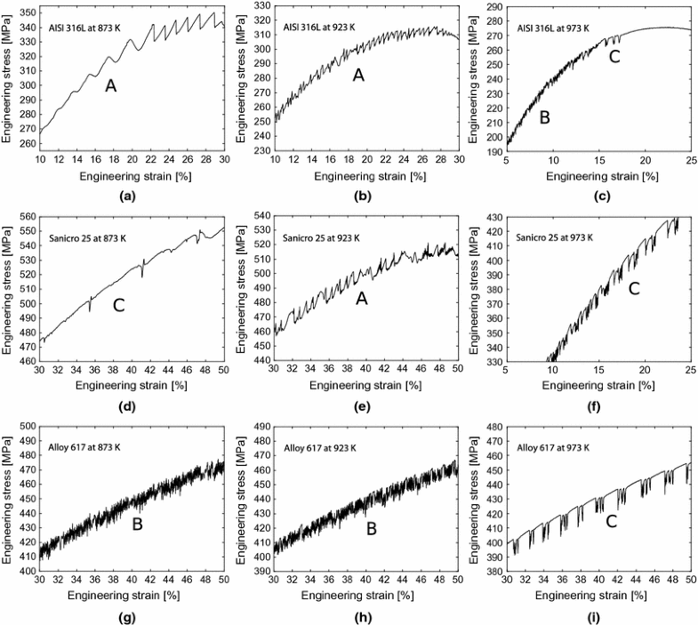 Serrated yielding and PLC-type in engineering stress–strain curves at elevated temperatures [873 K, 923 K, and 973 K (600 \(^{\circ }\)C, 650 \(^{\circ }\)C, and 700 \(^{\circ }\)C)] of AISI 316L (a–c), Sanicro 25 (d–f) and Alloy 617 (g–i)