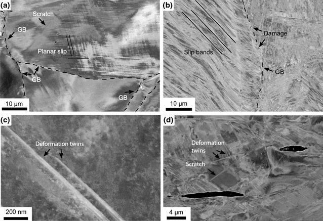 Damage behavior during the tensile testing: at 923 K (650 \(^{\circ }\)C), interaction of deformation bands and grain boundaries in Sanicro 25 (a), interaction of planar slip and grain boundaries in Alloy 617 (b), intersection of two small deformation twins creating a localised strain offset in Sanicro 25 (c) and intersection of several small twins creating a local strain offset each at 973 K (700 \(^{\circ }\)C) in Alloy 617 (d). GB means grain boundary