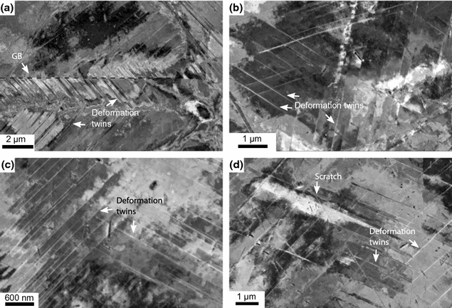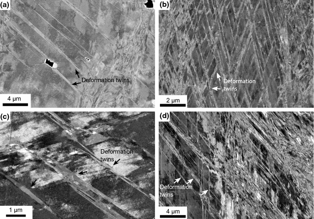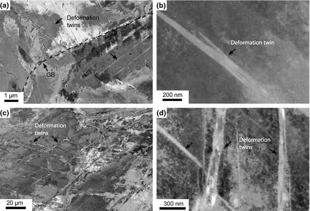 Formation of deformation twins; at RT in Sanicro 25 (a) and Alloy 617 (b), and at 923 K (650 \(^{\circ }\)C) in Sanicro 25 (c) and Alloy 617 (d)