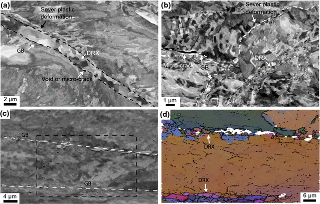 At higher temperatures, when the recovery mechanisms are active, AISI 316L shows damage at grain boundaries, as can be seen in Figures 11(a) and (b). The dislocation density is increasing as the plastic deformation proceeds at the grain boundaries, as severe plastic deformation in Figures 11(a) and (b), suppressing further deformation. If the recovery occurs, i.e. formation of subgrains and recrystallization at the grain boundaries, as shown in Figures 11(c) and (d), they will soften the grain boundary regions and dislocations can again multiply in these regions. If this process is repeated, it will initiate microcracks, as shown in Figures 11(a) and (b), at the grain boundaries which may lead to fracture and lower ductility.[41]