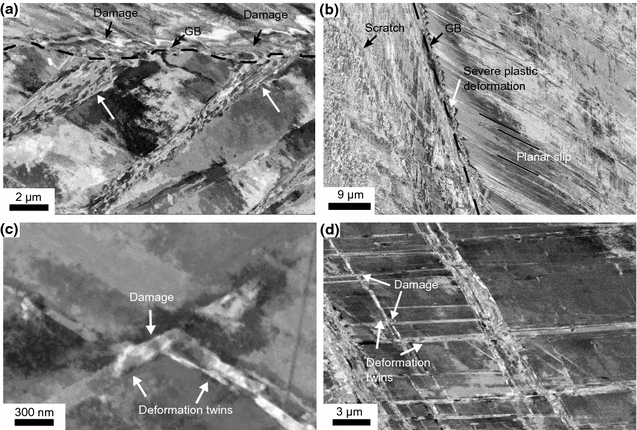 The main mechanisms contributing to material damage from local stress or strain intensity, were large deformation bands and/or slip bands creating local damage when intersecting with other deformation/slip bands or with grain boundaries. The deformation bands seemed to contain bundles of slip bands or shear bands; Figure 12(a) shows such deformation in Sanicro 25. Interactions between grain boundaries and planar slip have been observed to create severe plastic deformation zones, as shown in Figure 12(b) for Alloy 617, generating a local, severely plastically deformed microstructure. The small deformation twins generated micro-damage of localised strain offsets where twins interacted with each other, as shown in Figures 12(c) and (d), or with grain boundaries, creating a stress or strain concentration.
