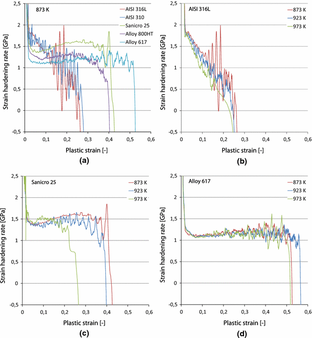 Strain hardening rate and true plastic strain curves: all the materials at 873 K (600 \(^{\circ }\)C) (a), AISI 316L (b), Sanicro 25 (c) and Alloy 617 (d) at 873 K (600 \(^{\circ }\)C) to 973 K (700 \(^{\circ }\)C)