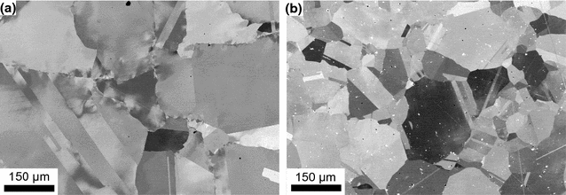 The EBSD technique was used to analyse the twin structure. EBSD was performed in a HITACHI SU-70 FEG-SEM equipped with an OXFORD EBSD detector. EBSD maps were measured at 15-kV acceleration voltage and a working distance of 25 mm and the EBSD maps were produced using a step size of 0.1 \(\mu \)m. The HKL software CHANNEL 5 was used for the microstructure evaluation.