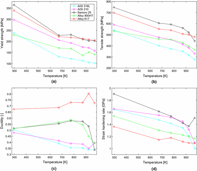 Figure 3(d) displays the strain hardening rates for all alloys (taken as the mean strain hardening rate in the 5- to 15-pct plastic strain interval). Some differences in hardening behavior between the materials were observed. The lower-alloyed stainless steels, AISI 316L and AISI 310, showed a rapid decrease in the strain hardening rate as the temperature exceeded 873 K (600 \(^{\circ }\)C). The more highly alloyed stainless steel, Sanicro 25, and the nickel-based alloys showed a relatively linearly decreasing strain hardening rate with increasing temperature. At 973 K (700 \(^{\circ }\)C), Sanicro 25 showed a sudden increase in strain hardening rate.