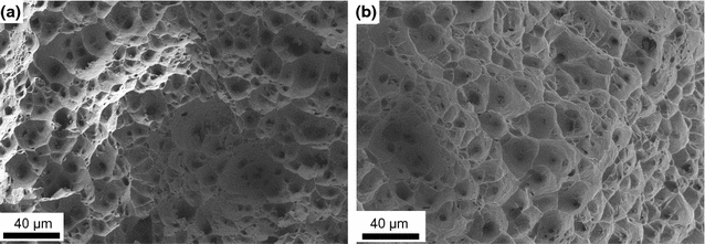 Ductile fracture surfaces in Sanicro 25 at RT (a) and 873 K (600 \(^{\circ }\)C) (b)