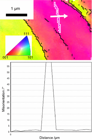 EBSD analysis displaying orientation and misorientation profile, showing deformation twin with angle 60 deg in Alloy 617 at 923 K (650 \(^{\circ }\)C). The black lines correspond to grain boundaries with a misorientation larger than 3 deg