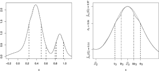Note that, although asymptotically the sign of \(\widehat{f}''_{h_{\tiny {\text{ PI }}}}(\widehat{x_i})\) is always correct (under the assumptions of Theorem 1), in the finite-sample case, it may not be negative in the modes or positive in the antimodes. In that case, an abuse of notation will be done, denoting as \(h_{\tiny {\text{ PI }}}\) to the critical or other plug-in bandwidth in order to guarantee that the sign of this second derivative remains correct.