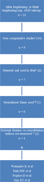 Comparative studies where tibial lengthening was performed over an intramedullary tibial nail and compared to tibial lengthening without the use of an intramedullary tibial nail. No language, publication date or publication status restrictions were applied.