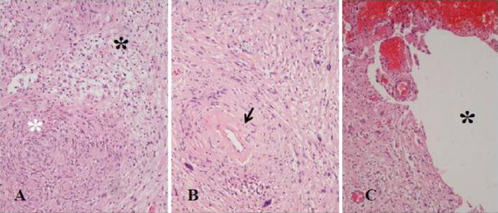 Hematoxylin and Eosin stain, original magnification ×10, a Alternating Antoni A (white asterisk) and Antoni B (black asterisk) patterns, b Hyalinized and thickened blood vessel (arrow). c Degenerative changes. Black asterisk: cystic area