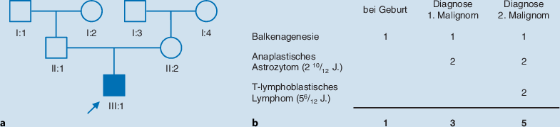 CMMRD-Patient mit verzögerter Diagnosestellung. a Stammbaum. b C4CMMRD-Score Indexpatient III:1. Bei dem erstgeborenen Sohn (III:1) eines gesunden, nicht-blutsverwandten Elternpaares (II:1, II:2) ohne eigene Krebserkrankung oder Lynch-Syndrom-assoziierte Tumoren in der Familienanamnese wurde pränatal eine Hirnfehlbildung diagnostiziert. Nach der Geburt wurde diese als Balkenagenesie (1 Punkt) bestätigt. Zudem zeigten sich zwei kapillare Hämangiome. Im Alter von 210/12 Jahren wurde ein anaplastisches Astrozytom im Spinalkanal diagnostiziert (2 Punkte). Mit 56/12 Jahren entwickelte der Junge ein T‑lymphoblastisches Lymphom (2 Punkte). Zu diesem Zeitpunkt wurde der CMMRD-Verdacht geäußert. Immunhistochemisch wurde bei der Untersuchung des Astrozytoms ein Ausfall von PMS2 im neoplastischen und nicht-neoplastischen Gewebe nachgewiesen. Das neoplastische Gewebe zeigte zudem einen Ausfall von MLH1. Die genetische Untersuchung identifizierte die compound heterozygoten Keimbahnmutationen PMS2:c.(538-?_803+?del)+(1121dupA) p.(Glu180HisfsTer30)+(Gln375AlafsTer7). Dieser Befund bestätigte die Verdachtsdiagnose einer CMMRD bei dem Indexpatienten (III:1; C4CMMRD-Score in b). Unter Berücksichtigung des Dreipunktesystems des C4CMMRD-Konsortiums hätte bereits bei Diagnose des anaplastisches Astrozytoms der Verdacht auf eine CMMRD gestellt werden können. (Erstbeschreibung in [70])