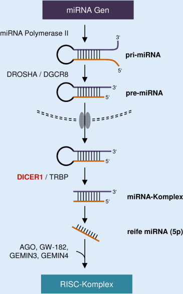 miRNA-Prozessierung. Der kanonische Weg der humanen miRNA-Prozessierung beginnt mit der Transkription eines Vorläufermoleküls, das als pri-miRNA bezeichnet wird. Die nukleäre Prozessierung des Transkripts am 5’- und 3’-Ende des Moleküls erfolgt durch einen DROSHA/DGCR8-Komplex. Das Produkt wird als pre-miRNA bezeichnet. Es wird aus dem Kern exportiert. Im Zytosol entsteht durch eine DICER1/TRBP-Komplex vermittelte Prozessierung ein miRNA-Komplex aus reifer 5p- und 3p-miRNA. Die reife miRNA kann dann mit anderen Faktoren den sogenannten „RNA-induced silencing complex“ (RISC) bilden. Dieser Komplex vermittelt die Hemmung der Proteinexpression von Zielgenen durch Translationsrepression sowie Deadenylierung und Abbau der mRNA. Abbildung modifiziert nach [63]
