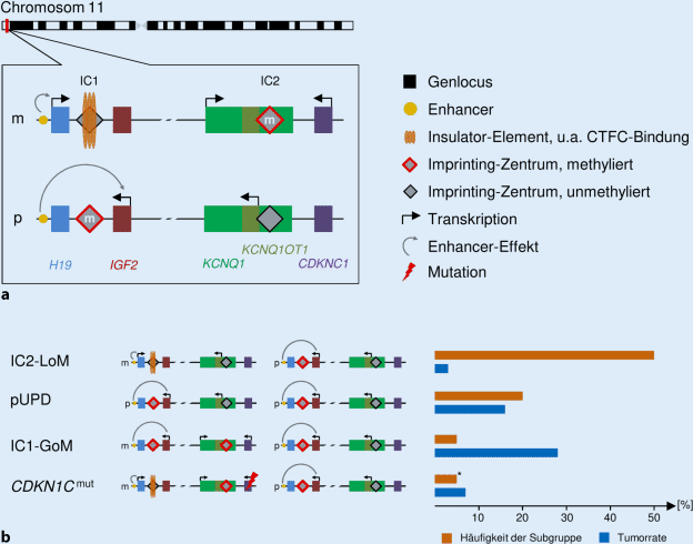 Beckwith-Wiedemann-Syndrom kritische Region. a Unter dem Ideogramm von Chromosom 11 sind relevante Elemente des maternalen (m) und paternalen (p) Allels vereinfacht dargestellt. Die IC1-Methylierung des paternalen Allels verhindert die Entwicklung eines Insulator-Elements und erlaubt die Interaktion des Enhancer-Elements mit IGF2. Das wachstumfördernde IGF2-Gen wird paternal exprimiert. Auf dem maternalen Allel unterbindet der Insulator die Interaktion von Enhancer und IGF2 und es erfolgt die Bildung verschiedener nicht kodierender Transkripte vom H19-Lokus. Die IC2-Methylierung auf dem maternalen Allel verhindert die Expression der langen nicht kodierenden RNA KCNQ1OT1, deren Expression auf dem paternalen Allel zu einem allelspezifischen Imprinting in cis führt. b Schematische Darstellung der vier häufigsten Subgruppen sowie Veranschaulichung ihrer prozentualen Häufigkeit (orange) und Tumorrate (blau). * Bei familiären Fällen Ursache bei bis zu 40 % der Fälle; IC2-LoM IC2 loss of methylation, pUPD paternale uniparentale Disomie, IC1-GoM IC1 gain of methylation, CDKN1C mut CDKN1C-Genmutation. Abbildung modifiziert nach [12]