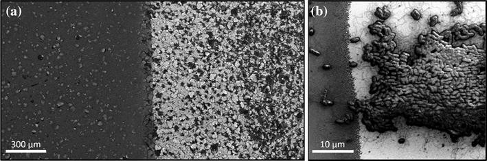 SEM images of the boundary between the gold-coated region (right) and uncoated region (left) of a silicon wafer incubated with cells displaying peptide p3-Au12 shown at (a) a low-magnification view of the boundary, (b) a high-magnification view of the boundary