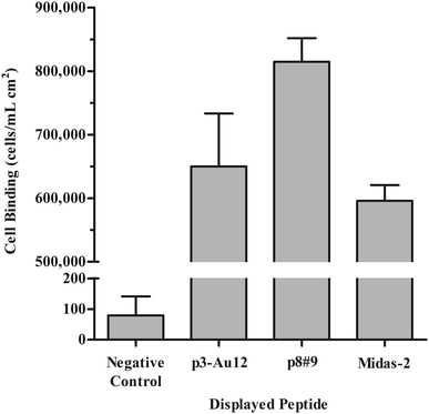 Binding of cells displaying gold-binding peptides to a gold wafer surface, adjusted for wafer sample size. Error bars represent the standard error of the mean (SEM) of two replicate samples