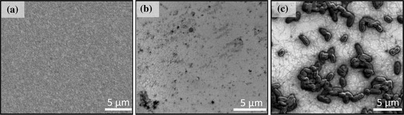 SEM images of the (a) bare gold surface, (b) negative control on gold and (c) cells displaying peptide p8#9 on gold