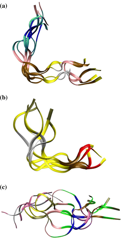 Molecular dynamic trajectories of (a) peptide p3-Au12, (b) peptide p8#9, and (c) peptide Midas-2