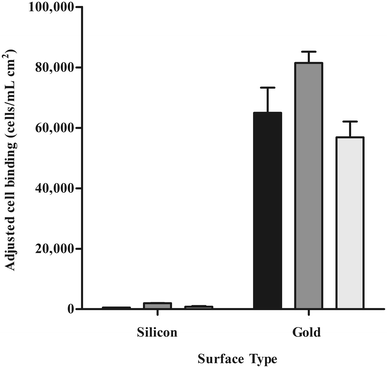 Binding comparison of cells displaying gold-binding peptides to silicon and gold. Peptide p3-Au12 (black bars), peptide p8#9 (dark gray bars), peptide Midas-2 (light gray bars). Error bars represent the standard error of the mean (SEM) of two replicate samples