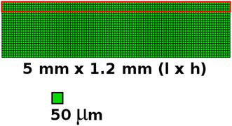 Mesh employed in the simulations, which is composed of equal quadrilateral elements (4 integration points per element) with element size of 50 μm. The red highlight shows the elements that are added during the simulation. Each layer of elements corresponds to one layer of powder (Color figure online)
