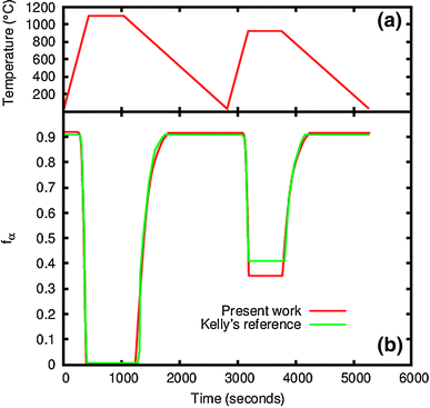 Validation of the implemented equations for microstructure evolution compared to the reference work of Kelly.21 Using the mesh domain of Fig. 1 as a solid block without additive manufacturing features, the mesh was constrained to follow the temperature path shown in (a). During temperature evolution, volume fraction of \(\alpha \) phase was recorded and compared to the one computed in Ref. 21 b). (a) and the green curve in (b) are adapted with permission from Ref. 21