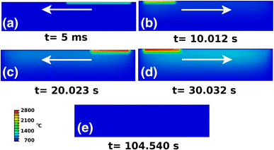 Evolution of the temperature field during addition of four layers of powder. The arrow shows the direction of movement of the beam on each layer. Notice the heat accumulation at the sides of the scan track, caused by the low thermal conductivity of the powder compared to that of the bulk metal