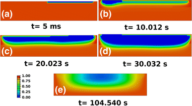 Evolution of the volume fraction of \(\alpha \) phase at the same time frames as in Fig. 3. As the local temperature exceeds the beta transus, the alloy is purely in \(\beta \) phase (blue color). Later, as the material cools, \(\alpha \) nucleates from \(\beta \) with time dependence dictated by Eq. 4 in the text. Notice that, after deposition and scanning of a subsequent layer, the heat distribution is sufficient to transform \(\alpha \) into \(\beta \) at a considerable depth from the free surface, of around ten equivalent build layers. Finally, after the last layer is scanned, cooling induces the final transformation of \(\beta \) into \(\alpha \), which also involves the entire domain and not only the upper layer of material (Color figure online)