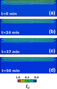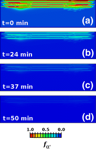 Evolution of the volume fraction of martensite \(\alpha '\) after completion of the four-layer scan, for a simulation in which machine parameters from selective laser melting were taken, in particular, where the boundary temperature was kept fixed at \(30^\circ {\rm C}\). (a) Martensite distribution immediately after scan of the fourth layer. (b)–(d) Limited martensite decomposition even after 50 min from the end of the build, because the domain temperature is not high enough to allow a significant rate of decomposition