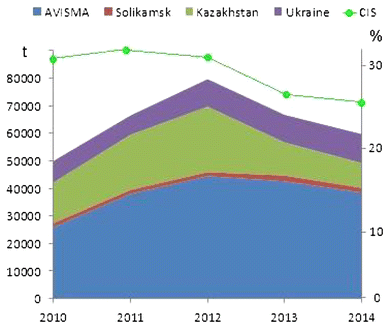 Sponge production in CIS countries from 2010–2014 and their share to the global production