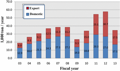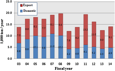 Amount of Ti mill product in Japan as a function of calendar year; including estimated amount (courtesy of Japan Titanium Society)