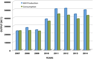 Changes of output and consumption of titanium mill products of China in last 8 years